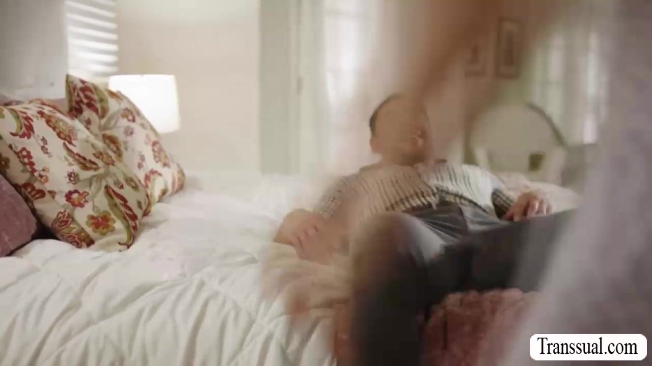 Sexy trans woman and her horny husband are in the room teasing each other.After that,they move into the bed and start kissing each other.Next is,she throats husbands big cock passionately and in return,she gets her ass bareback fucked.