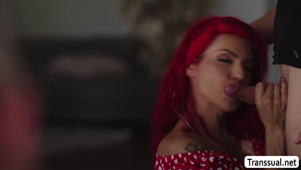 Big tits and redheaded Ts Foxxy makes out with stud Tony Sting while her man watches.The busty tranny deephthroat blowjobs his friends big cock.The dude bareback anal fucks her big asshole in several positions as her bf masturbates on the couch.