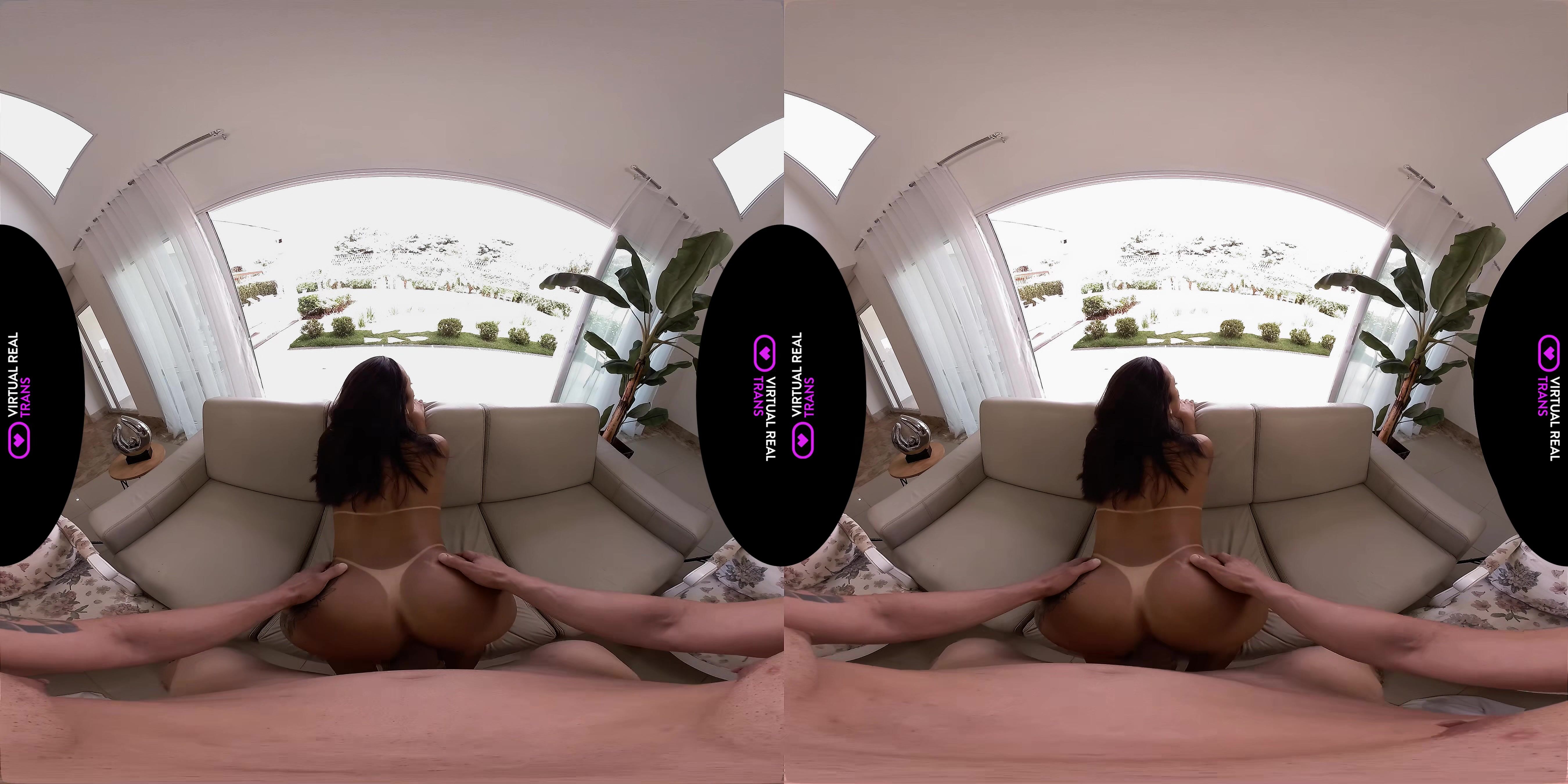 Alluring brunette, Sayuri Vicker, watches VirtualRealTrans in her VR goggles. You can’t help but feel horny as you watch the stunning hottie with natural ass play with herself while watching VR Porn. While Sayuri is enjoying the virtual show, she reaches out for your rod. She excitedly takes off the VR goggles as soon as she feels your hard shaft. Sayuri gives you a tantalizing blowjob before riding on top of you like a real cowgirl. The beautiful tattooed bombshell then bends over on the couch and lets you make love with her doggystyle. She returns the pleasure by pounding your behind in missionary. The two of you continue with the sensual couch sex until you give Sayuri a dripping anal creampie.