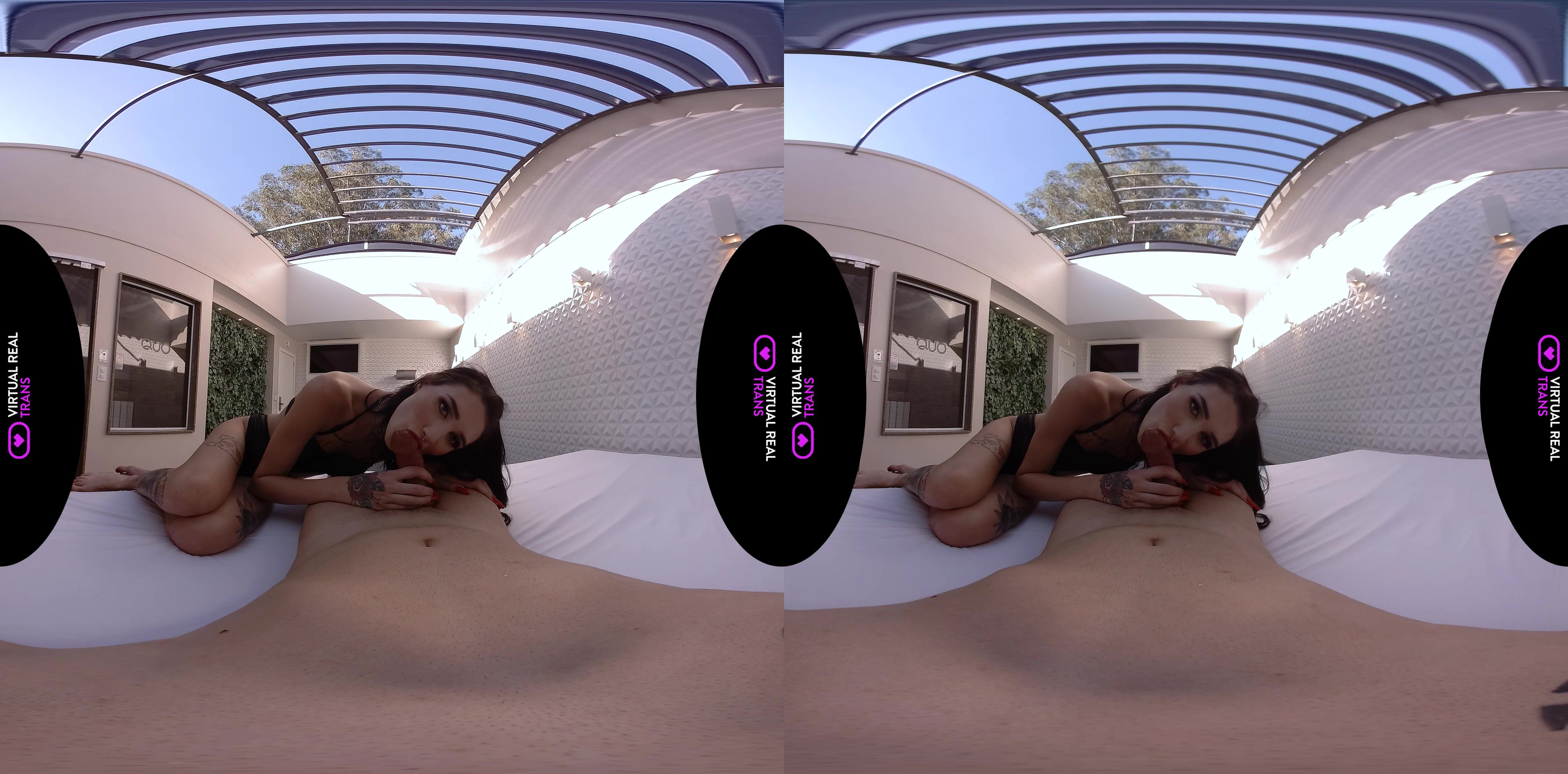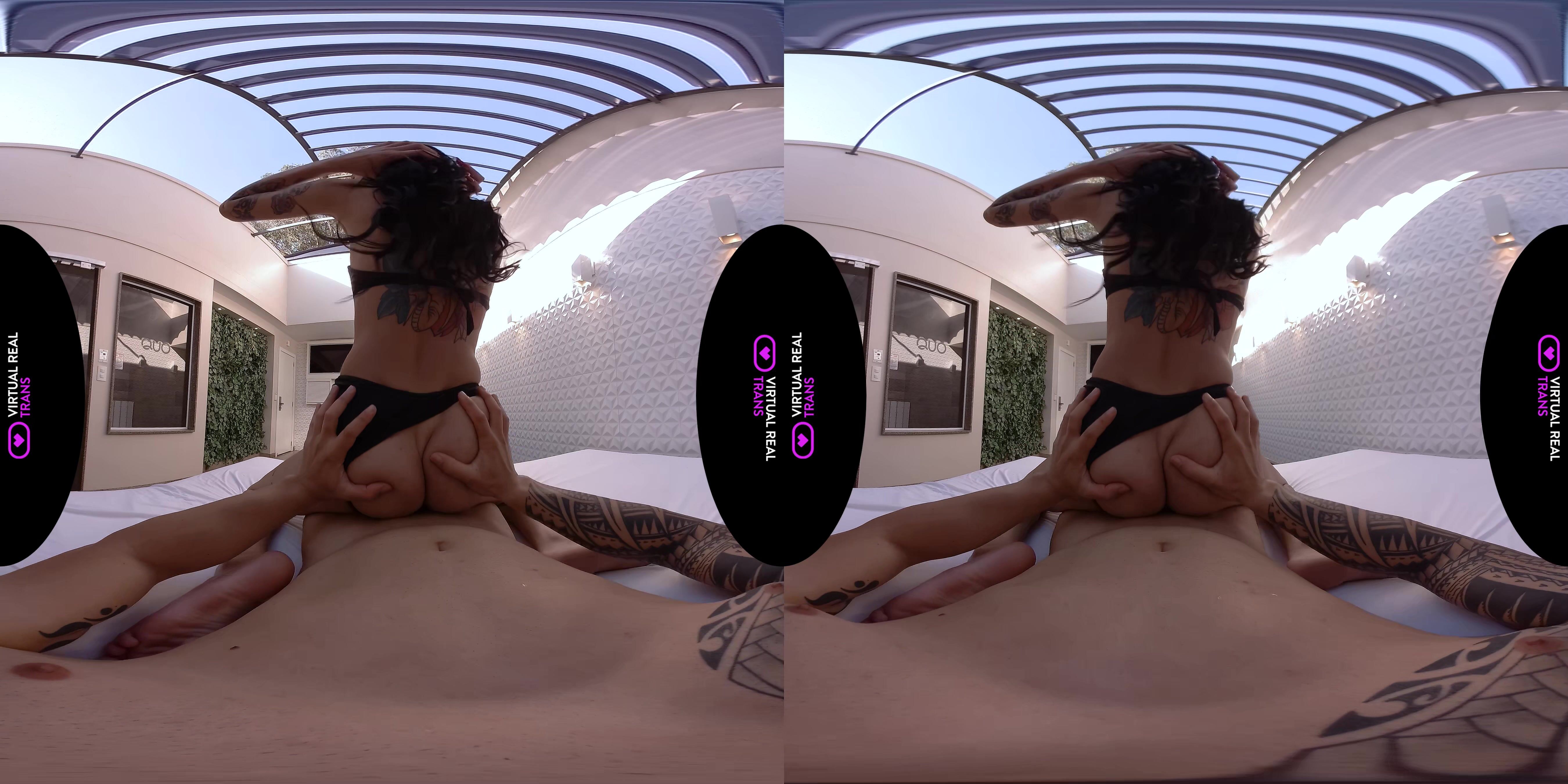 Nothing beats a relaxing morning swim with your beautiful girlfriend, Marcela Dimov. You watch the stunning TS bombshell as she takes a dip in the pool. Marcela knows that watching her hot body get wet is relaxing enough for you, but there’s something she knows she can do to make your day off a lot better. She approaches you as water drips off her black bikini. Marcela then reaches for your rod and gives it a quick blowjob. After making sure you are all hard and ready, the tattooed beauty rides you in cowgirl and reverse cowgirl positions. Not wanting to let her do all the work, you fuck Marcela in missionary and doggy until you both cum on each other.