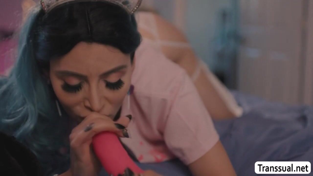 Whore shemale Korra Del Rio invites her guy neighbor to watch her while shes toying her ass in her room.After that,she calls the guy neighbor and lets him bareback fuck her wet ass.In return,she throats his dick and lets him analed her ass again.