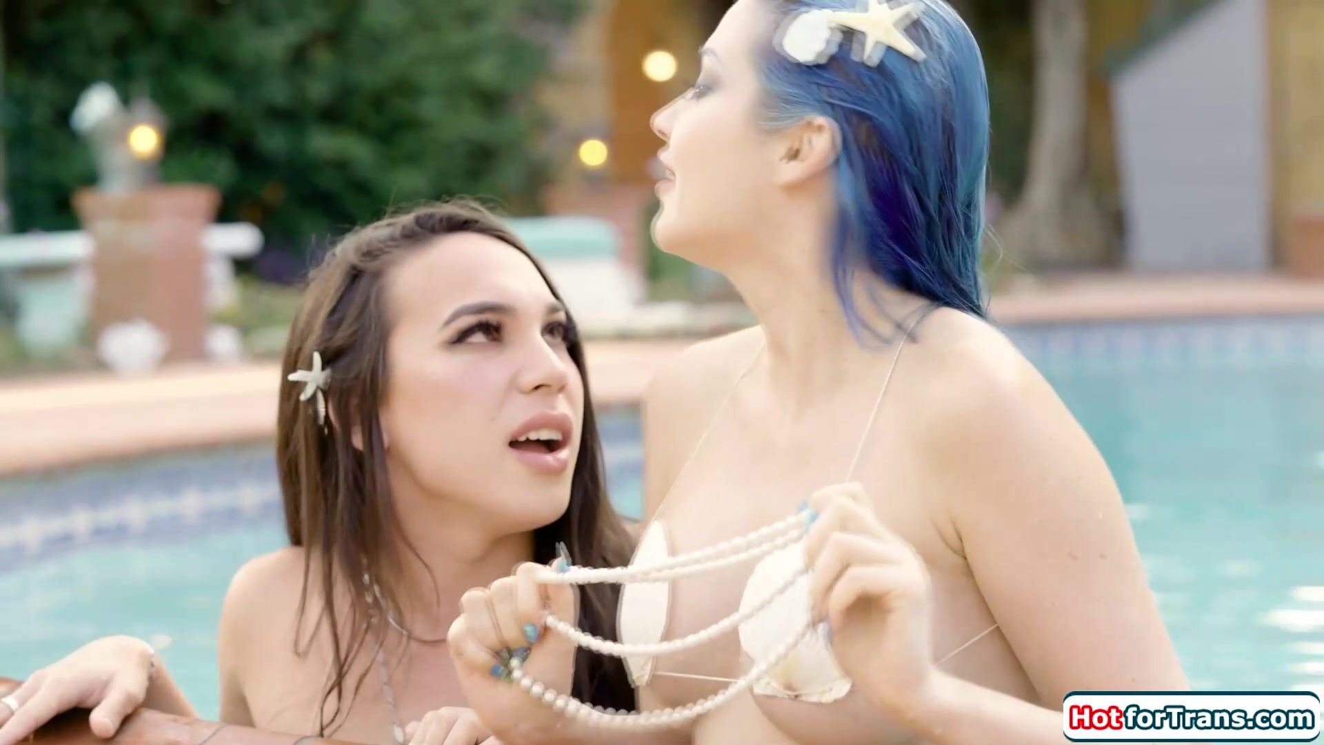 Asian tgirl mermaid Kasey Kei and busty mermaid gf Jewelz Blu get onto land.Intrigued that on has a cock and the other a pussy they touch each other.The small tits shemale is deepthroated and licks the big boobs babes shaved pussy before fucking her